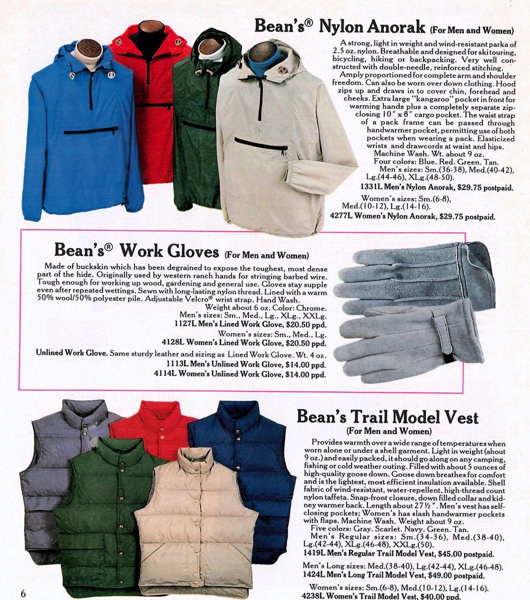 And that’s what I love about L.L. Bean. The design language isn’t romantic until much later. At the beginning it’s all straightforward logic. Something needs to carry ice. Fine. Make it strong. Make it simple. Make it last. And somehow, decades later, that same tote becomes the thing everyone’s carrying to cafés, campuses, and Japanese menswear shops. But at its core it’s still an ice carrier, which explains why it feels so solid and dependable. The DNA never changed.